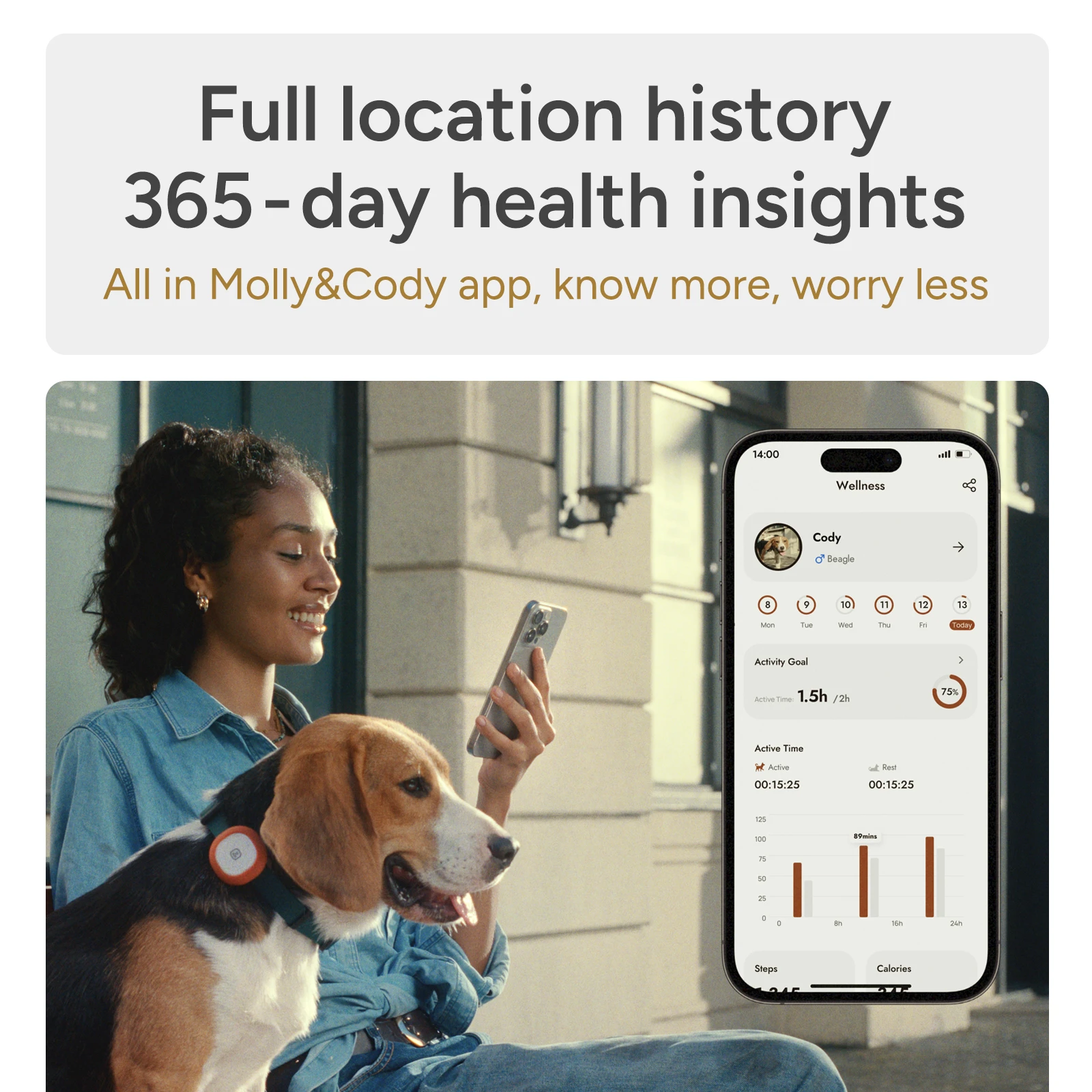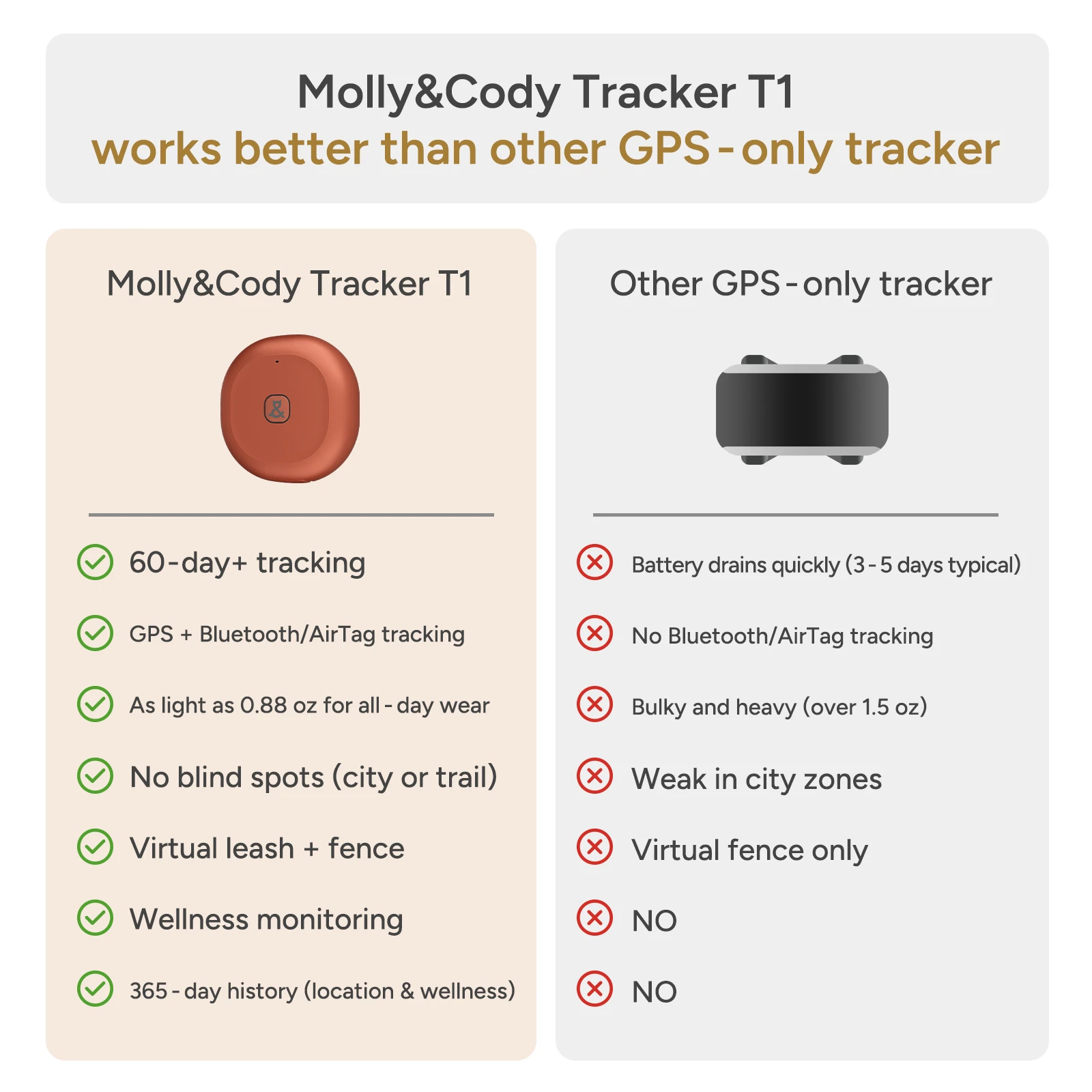 Molly&Cody GPS + Bluetooth Pet Tracker for Cats & Dogs – Real‑Time Tracking, Virtual Fence, IP67 Waterproof, Up to 60‑Day Battery, Health Monitoring, iOS/Android – Subscription Required