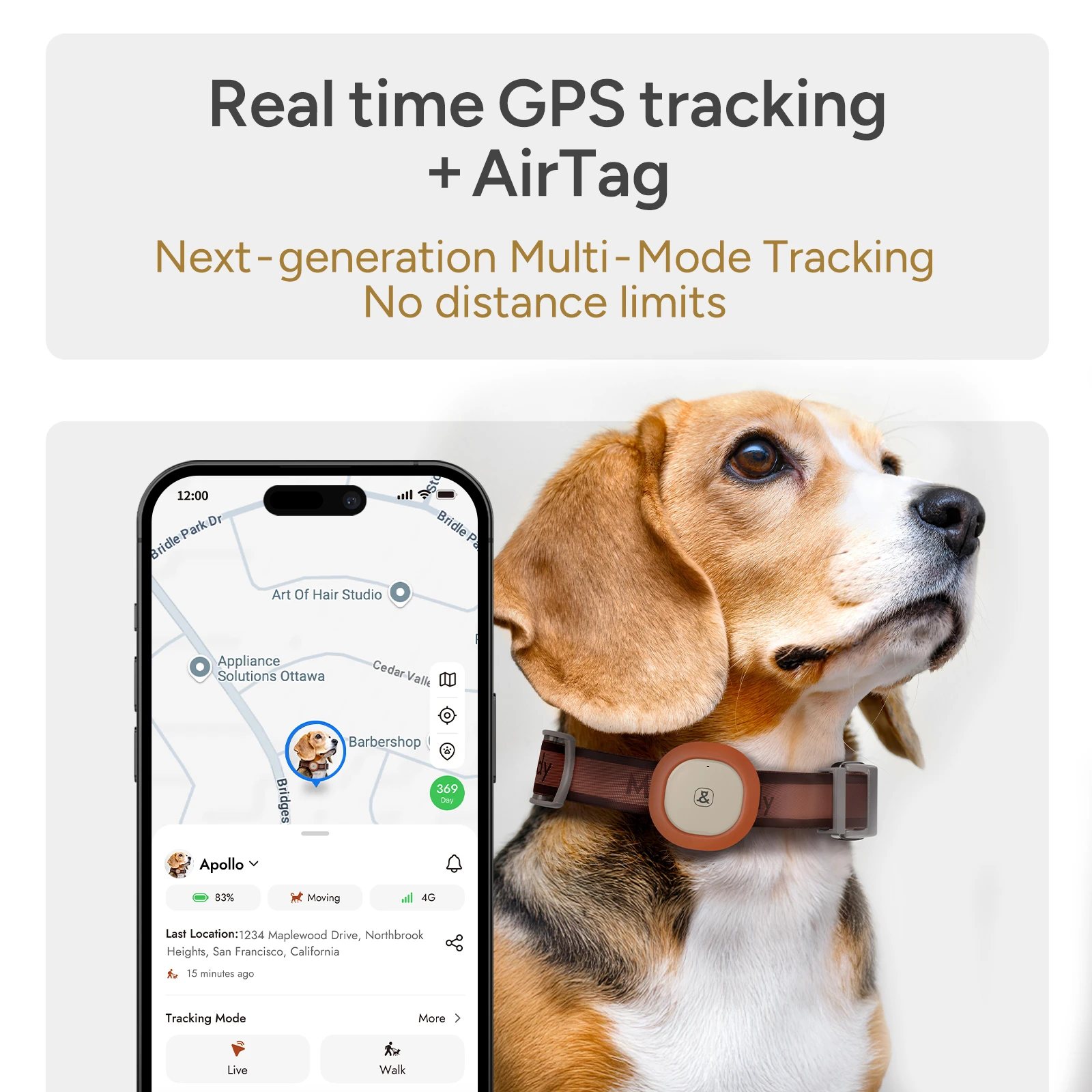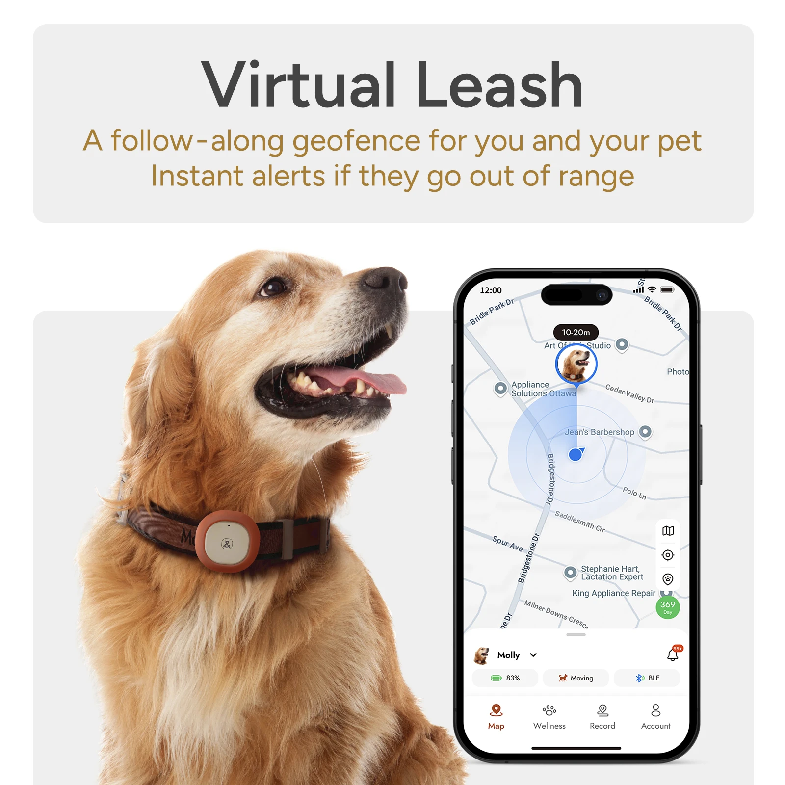 • Virtual Leash with Geofence Alerts - Safe zone that moves with you; instant alerts and live GPS when your pet goes beyond range.
